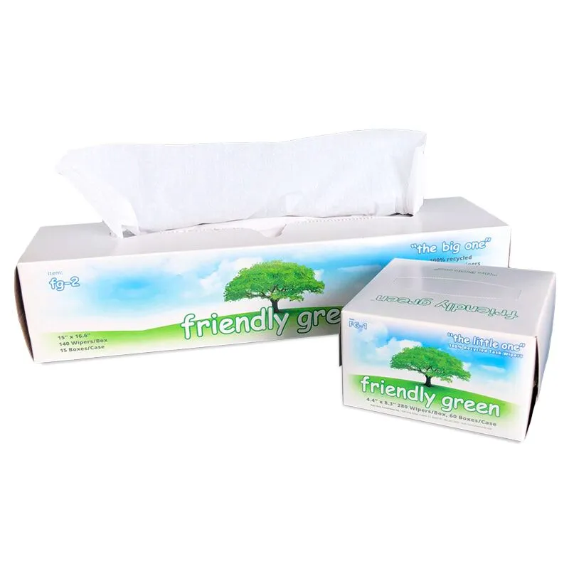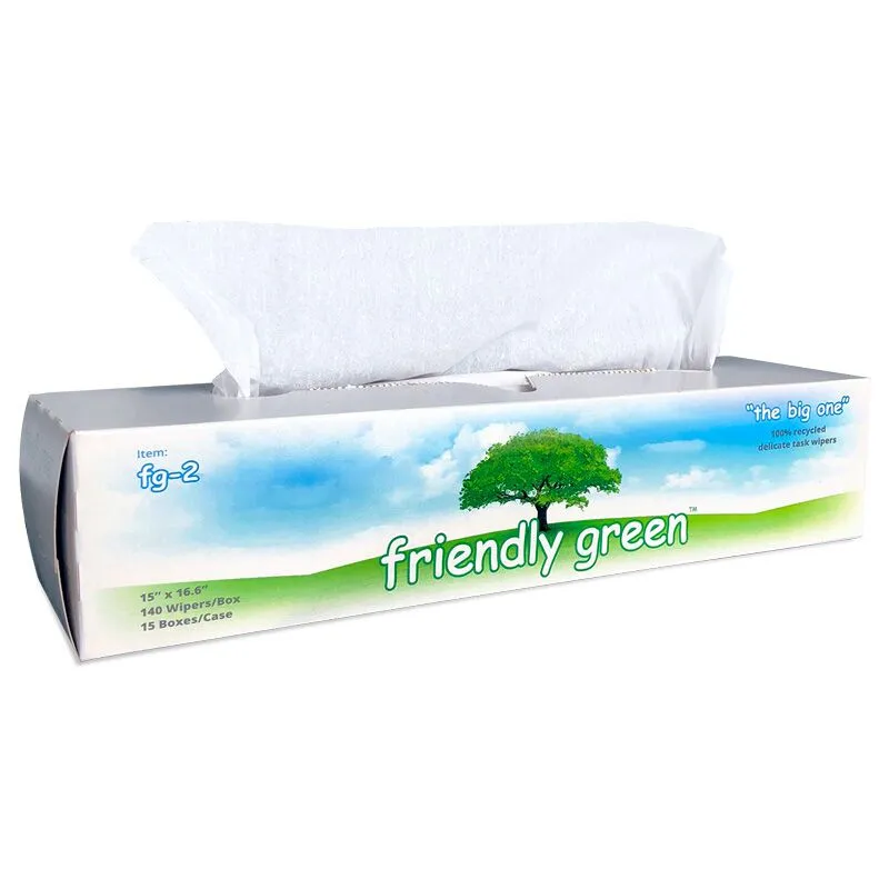Friendly Green® “The Big One” is the perfect large (15″ x 16.6″) lab wipe. These wipes are made from 100% recycled cellulose (at least 50% post consumer). They are packaged in recycled and biodegradable boxes, making them the complete environmentally friendly wipe option. Friendly Green™ lab wipes are single ply, low linting, very absorbent, soft and will not scratch. They are excellent for light duty tasks and delicate surfaces. Because they are very low in lint and chemical extractables, they will leave surfaces very clean. Friendly Green™ wipes are an excellent alternative to Kimberly Clark’s Kimwipes 34256 & 34155.