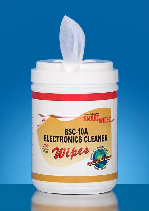 SuperSaturated SmartWipes® BSC-10A Electronics Cleaner Presaturated Wipes, Polyester, 6″ x 9″ (BSC) is the ultimate solvent product for benchtop defluxing and stencil/misprint cleaning. Effectively removes reflowed lead and lead-free paste residues, all types of flux residues, solder pastes, uncured SMD adhesives, silicone and acrylic conformal coatings and baked-on flux residues. It is a drop-in replacement for Bioact SC-10 and a suitable alternative to isopropyl alcohol (IPA), hydrocarbons, hydrofluoroethers (HFEs), hydrofluorocarbons (HFCs), HCFC-141b and HCFC-225.