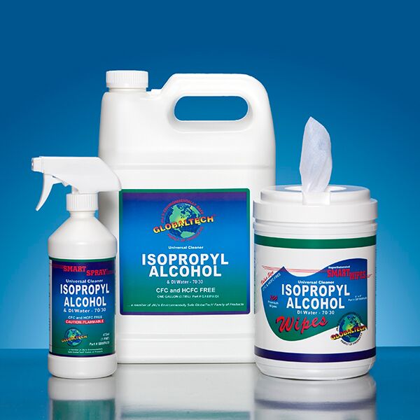 GlobalTech Isopropyl Alcohol & DI Water 70/30% blend (IPA/DI) is a non-aggressive universal cleaner, degreaser and disinfectant. Removes most types of inks, pastes, fluxes, light oils and other contaminates associated with assembly, machining, soldering and printing. Ideal for use in surface preparation prior to manufacturing or assembly processes. Saturated wipe material options: polyester, industrial grade and critical-clean.